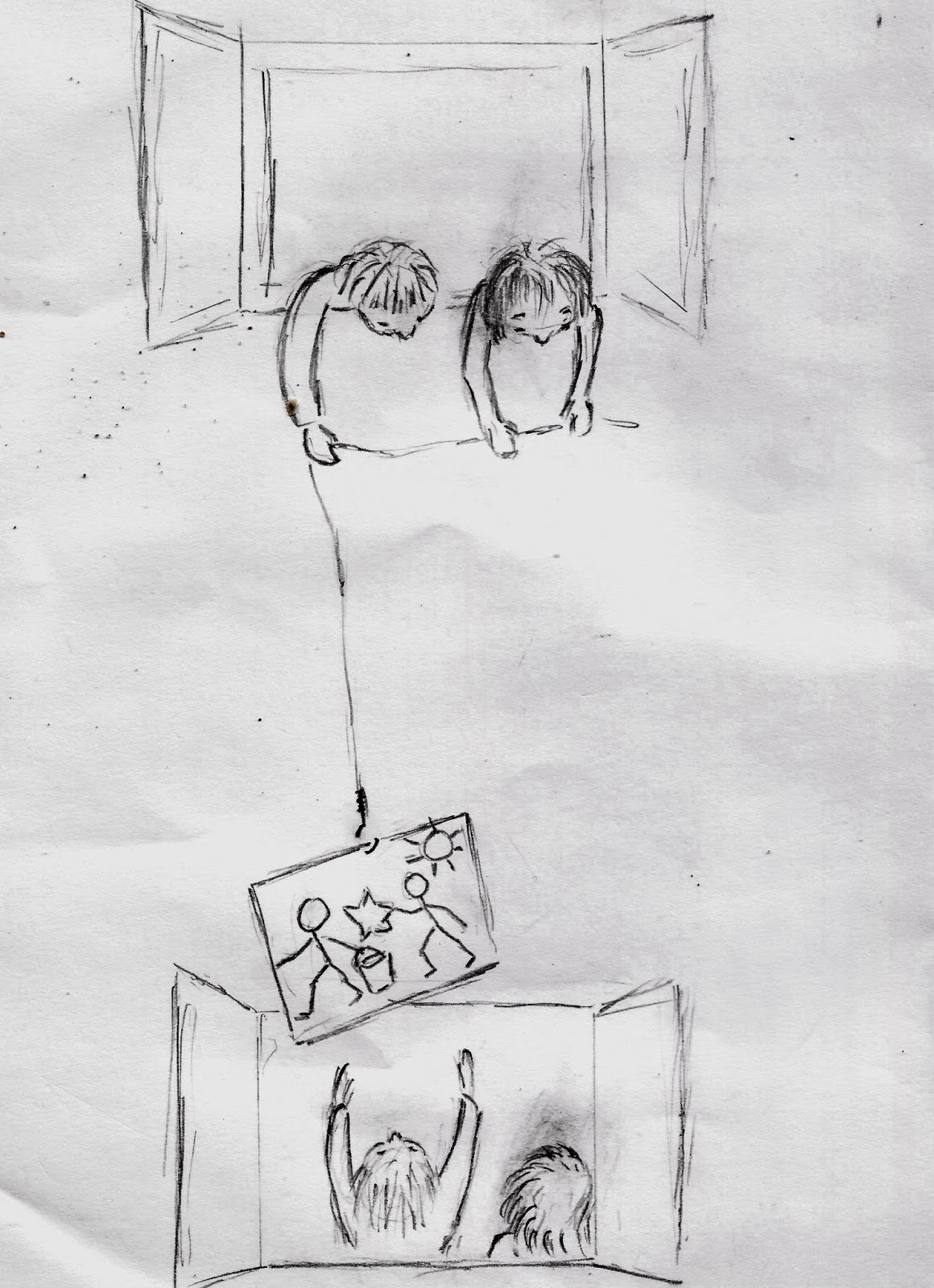 Zettel mit Strichfiguren. Die Strichfiguren zeigten, weil wir ja noch gar nicht